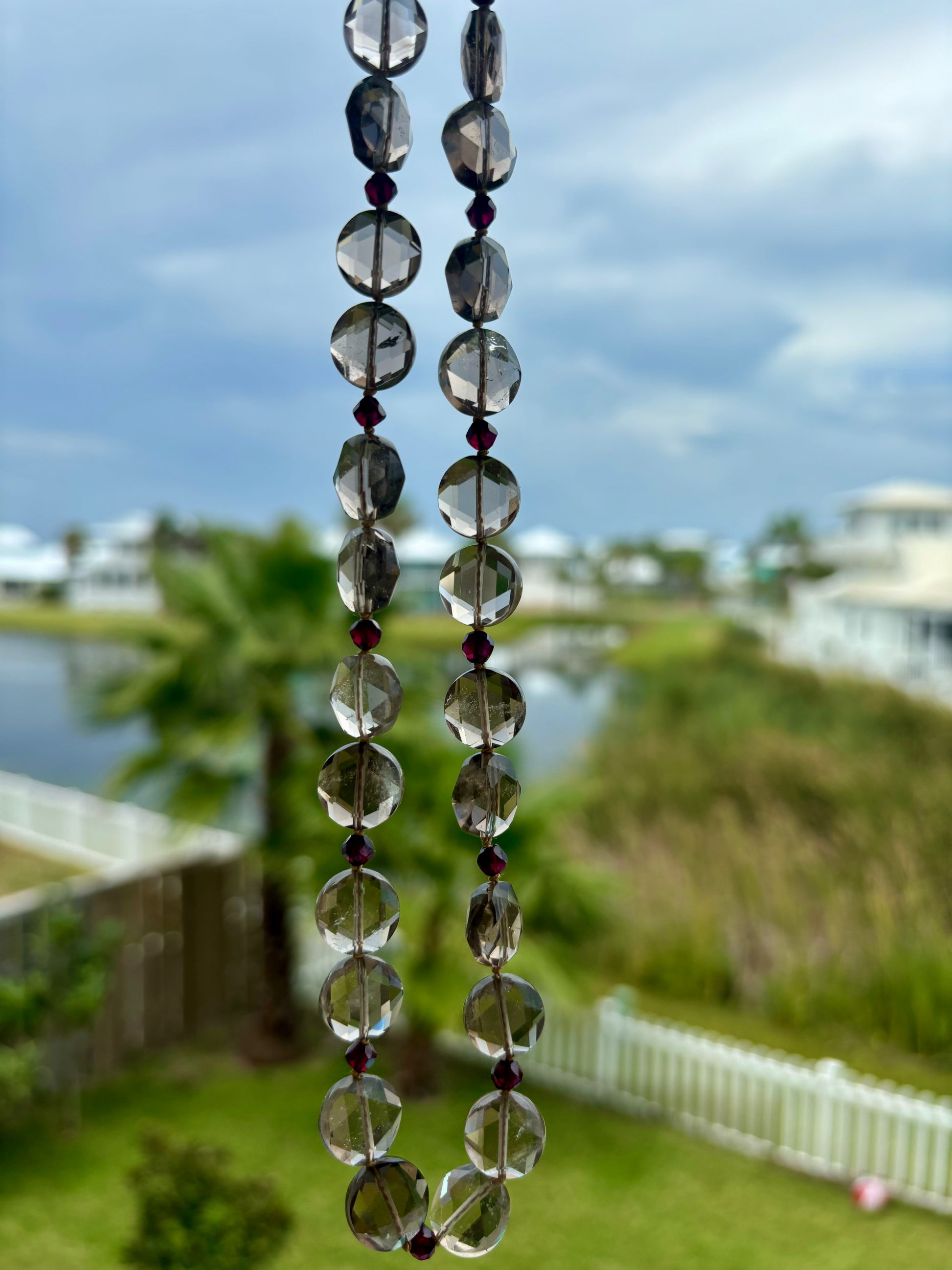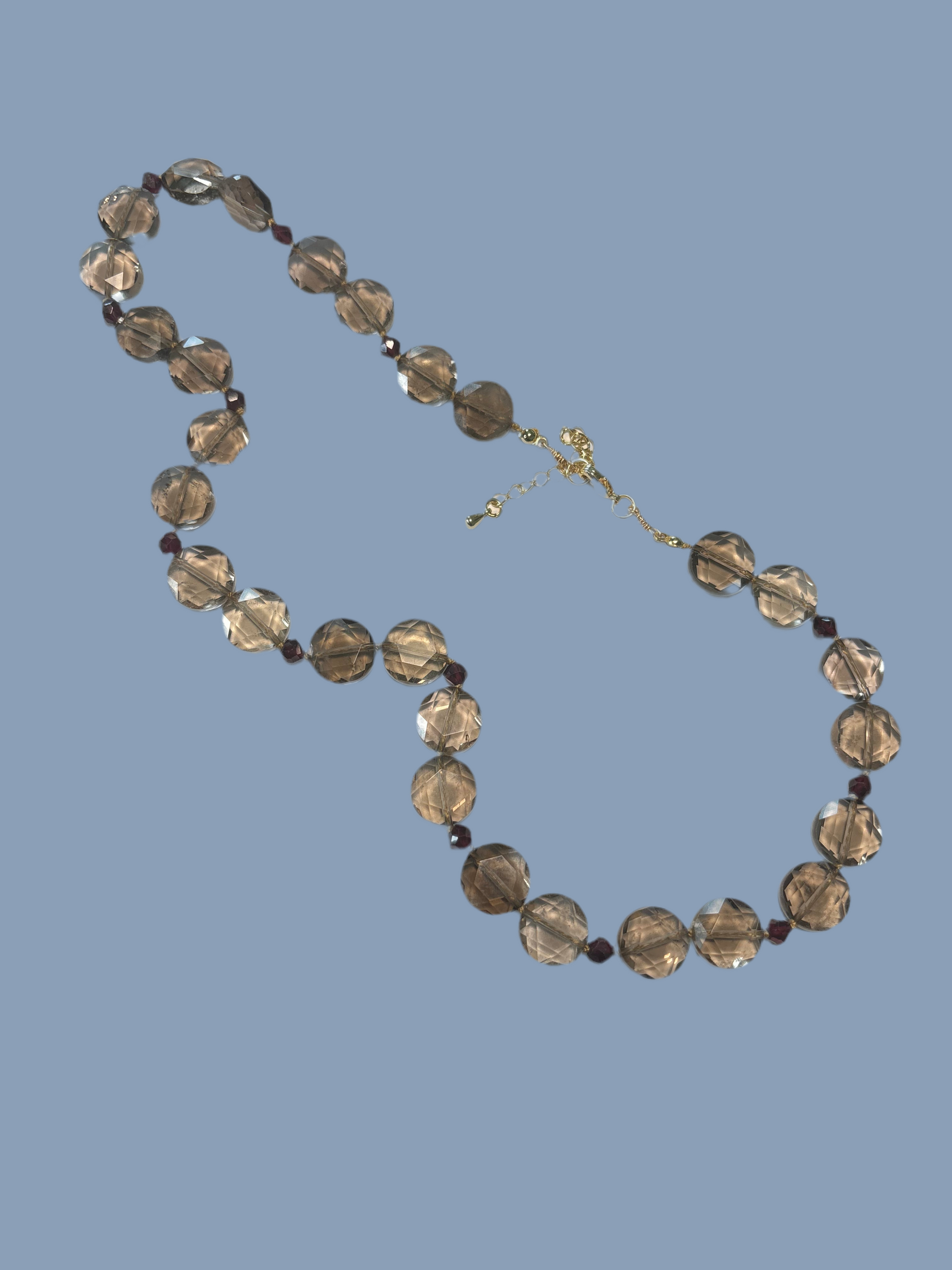 One of a kind. Knotted diamond cut faceted Smokey Quartz, faceted garnets, gold filled clasp and extender.