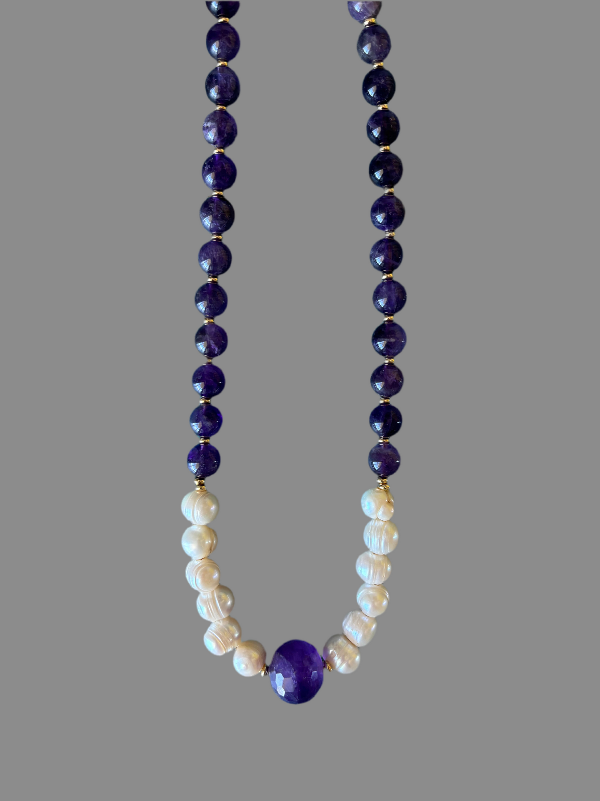 One and only piece. Faceted amethyst and freshwater pearls. 14mm amethyst faceted rondel centerpiece. Approx 20”gold filled clasp