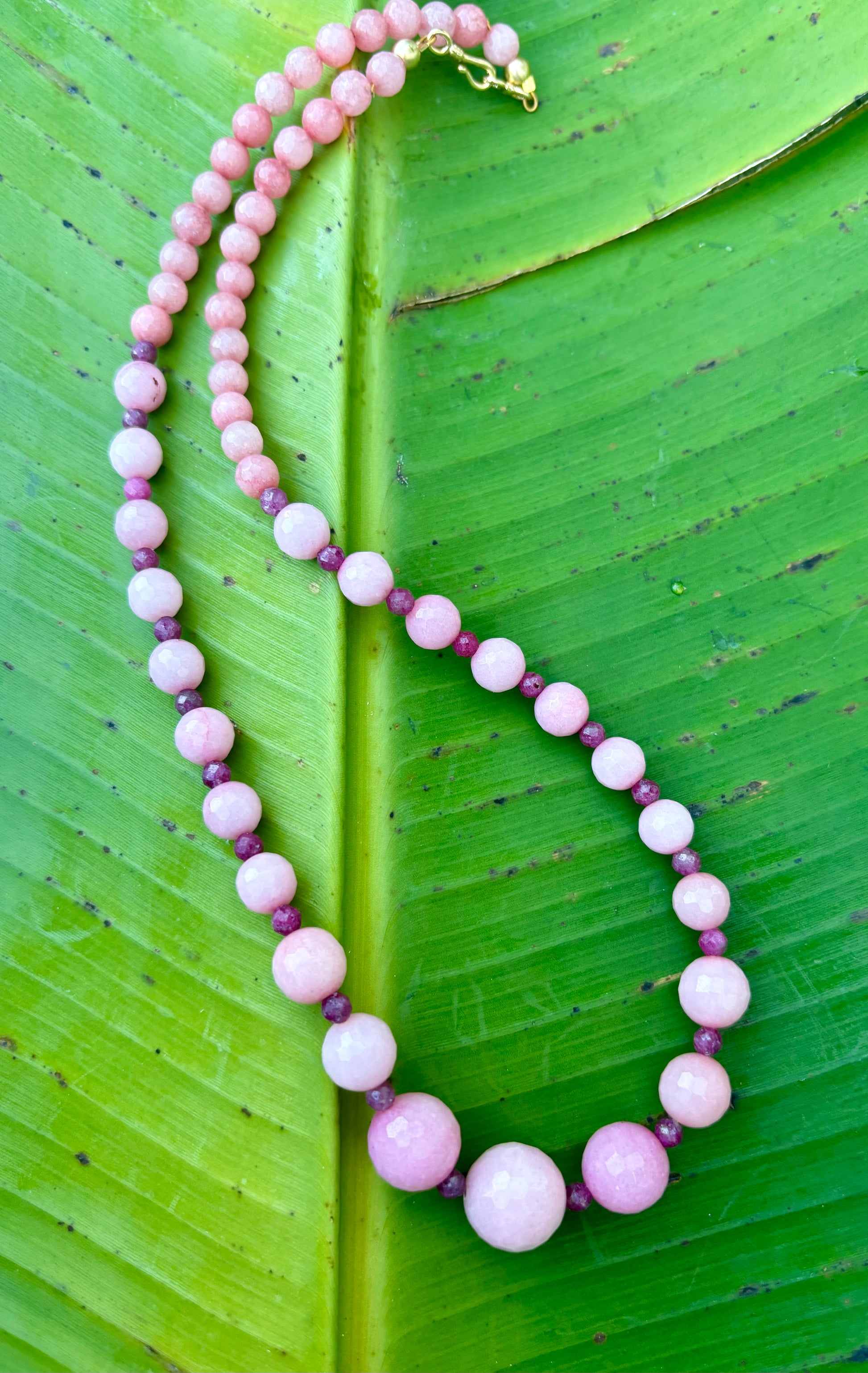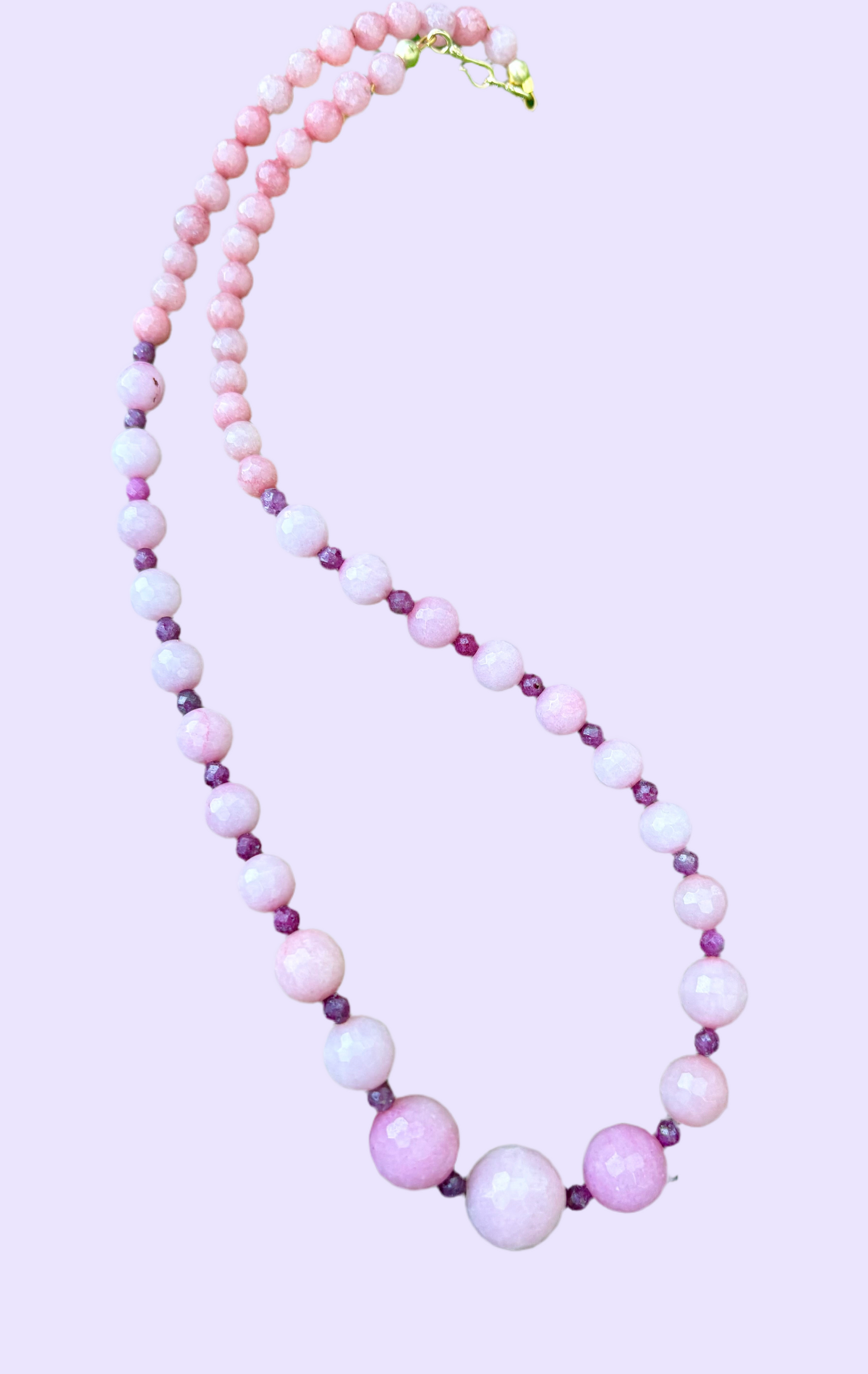 One of a kind piece. Pink faceted graduated Jade and faced Ruby. Approx 20”gold filled clasp hook