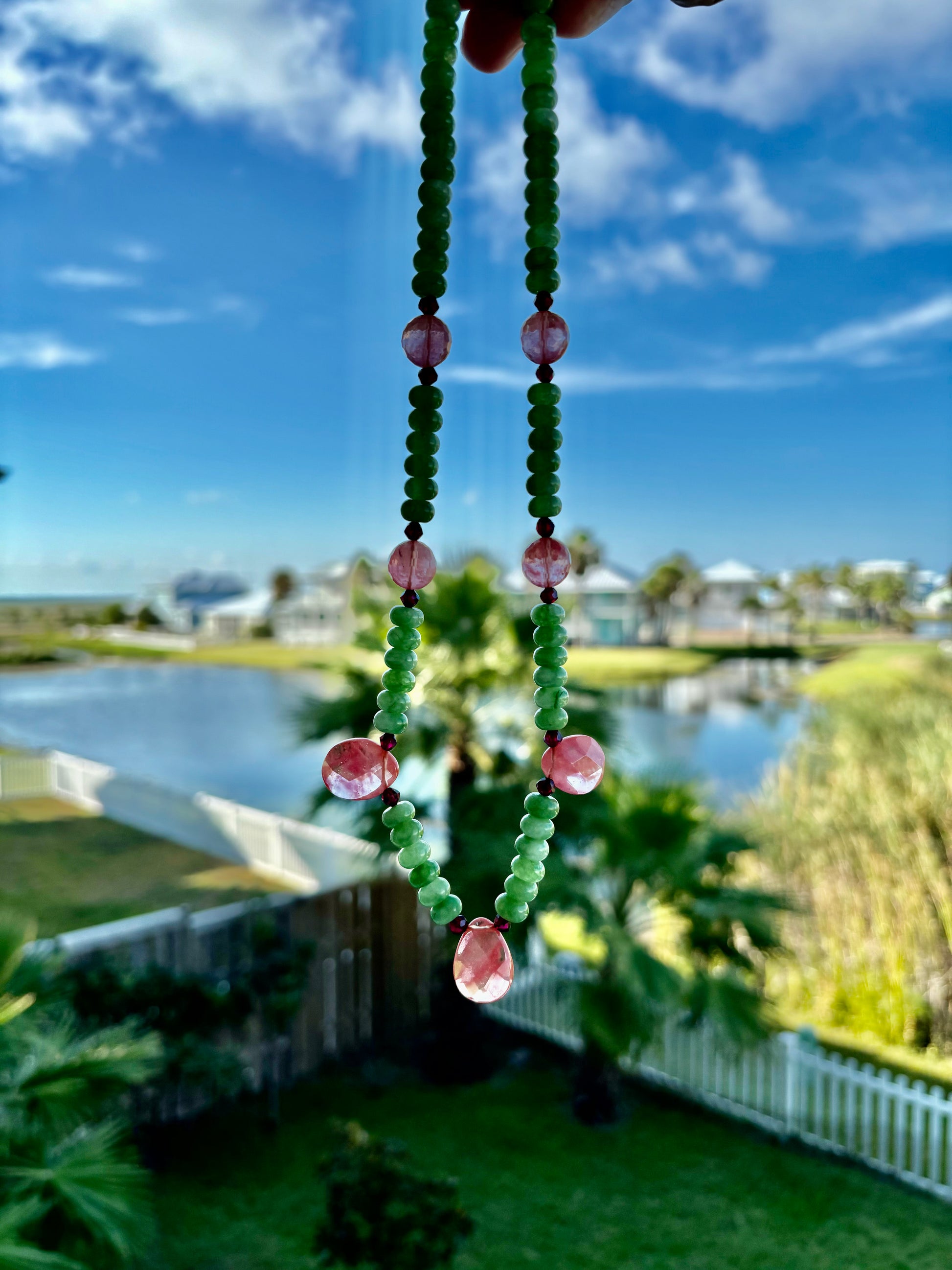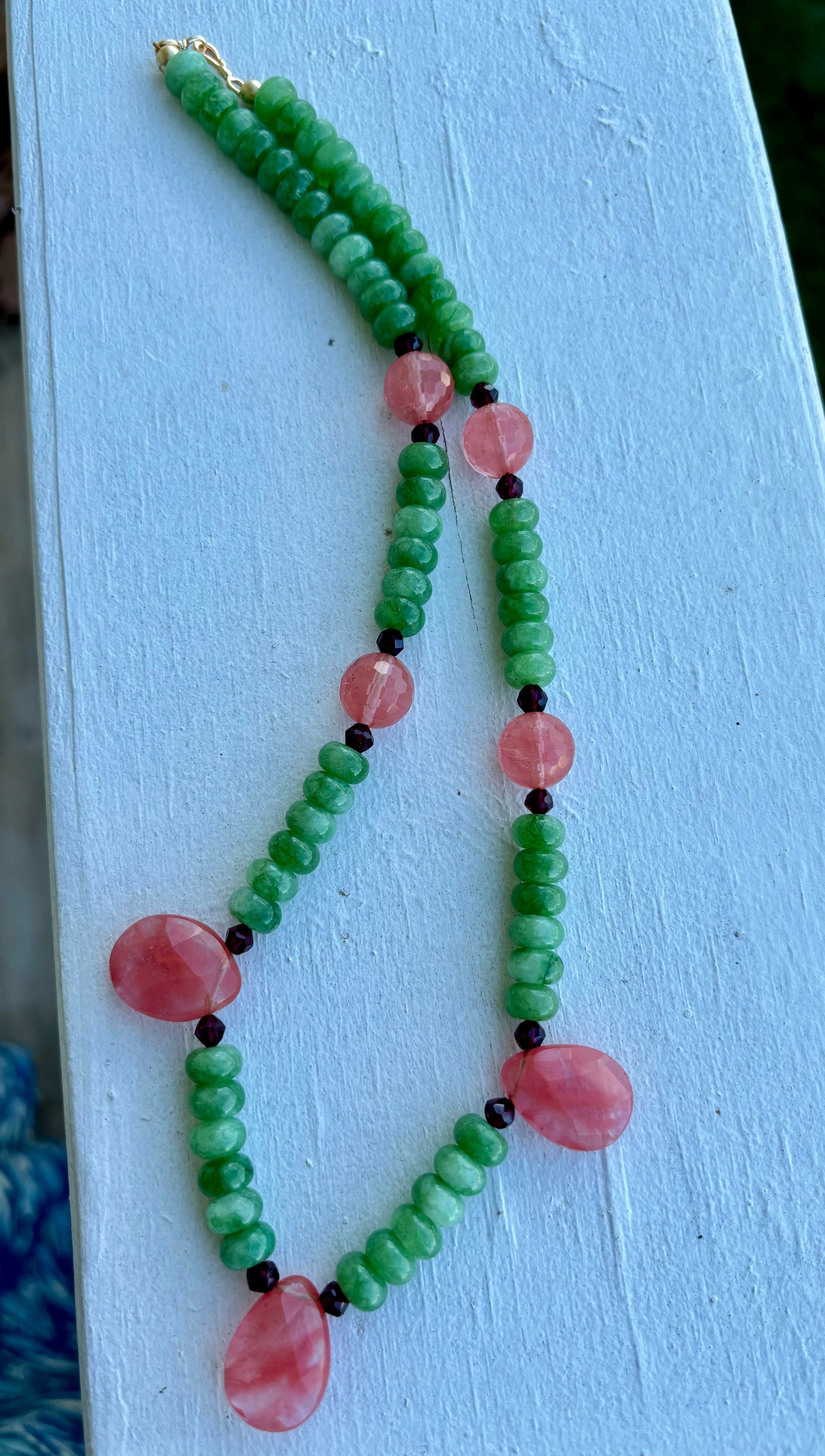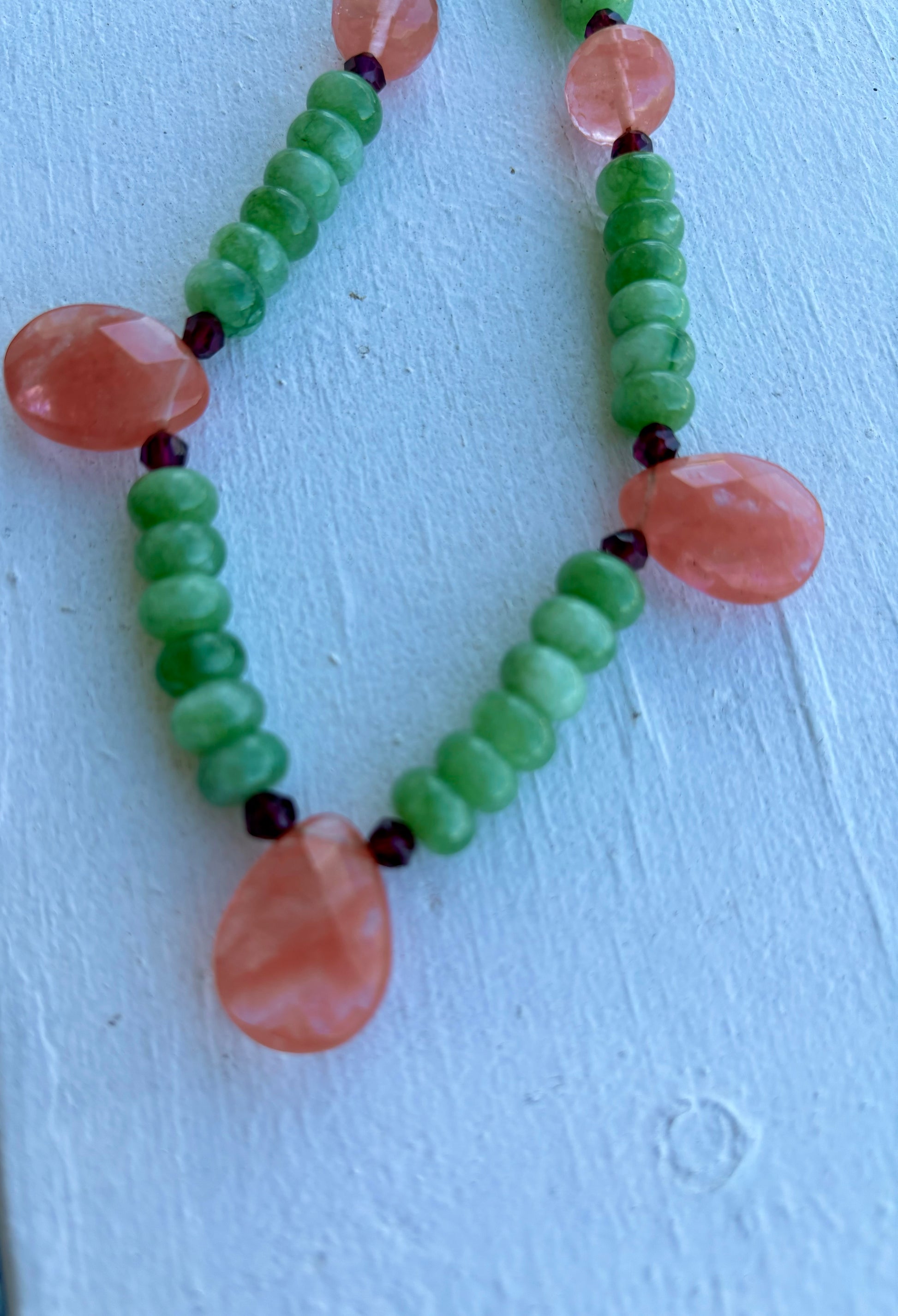Jade, strawberry quartz. And faceted garnets. Gold filled clasp