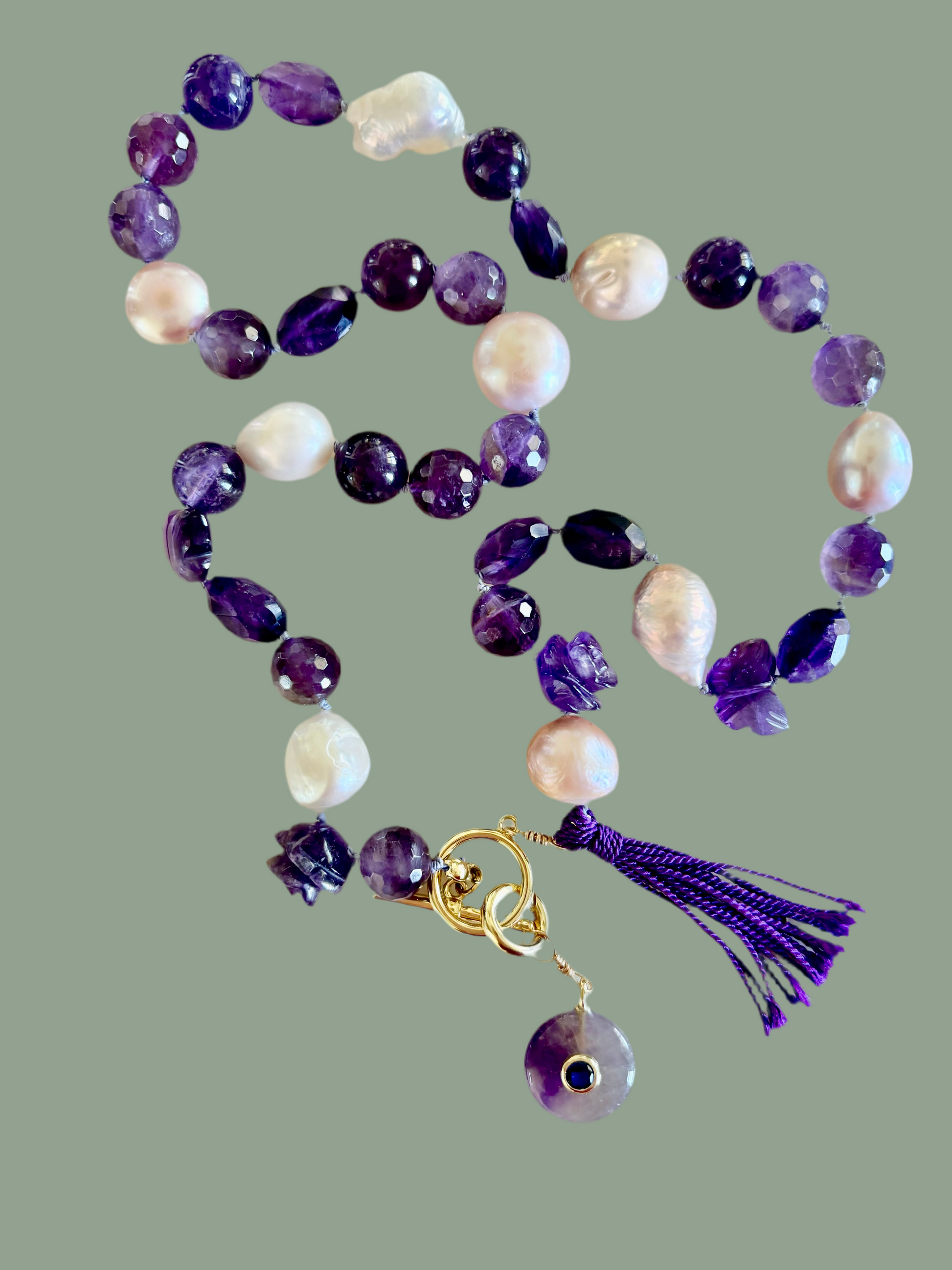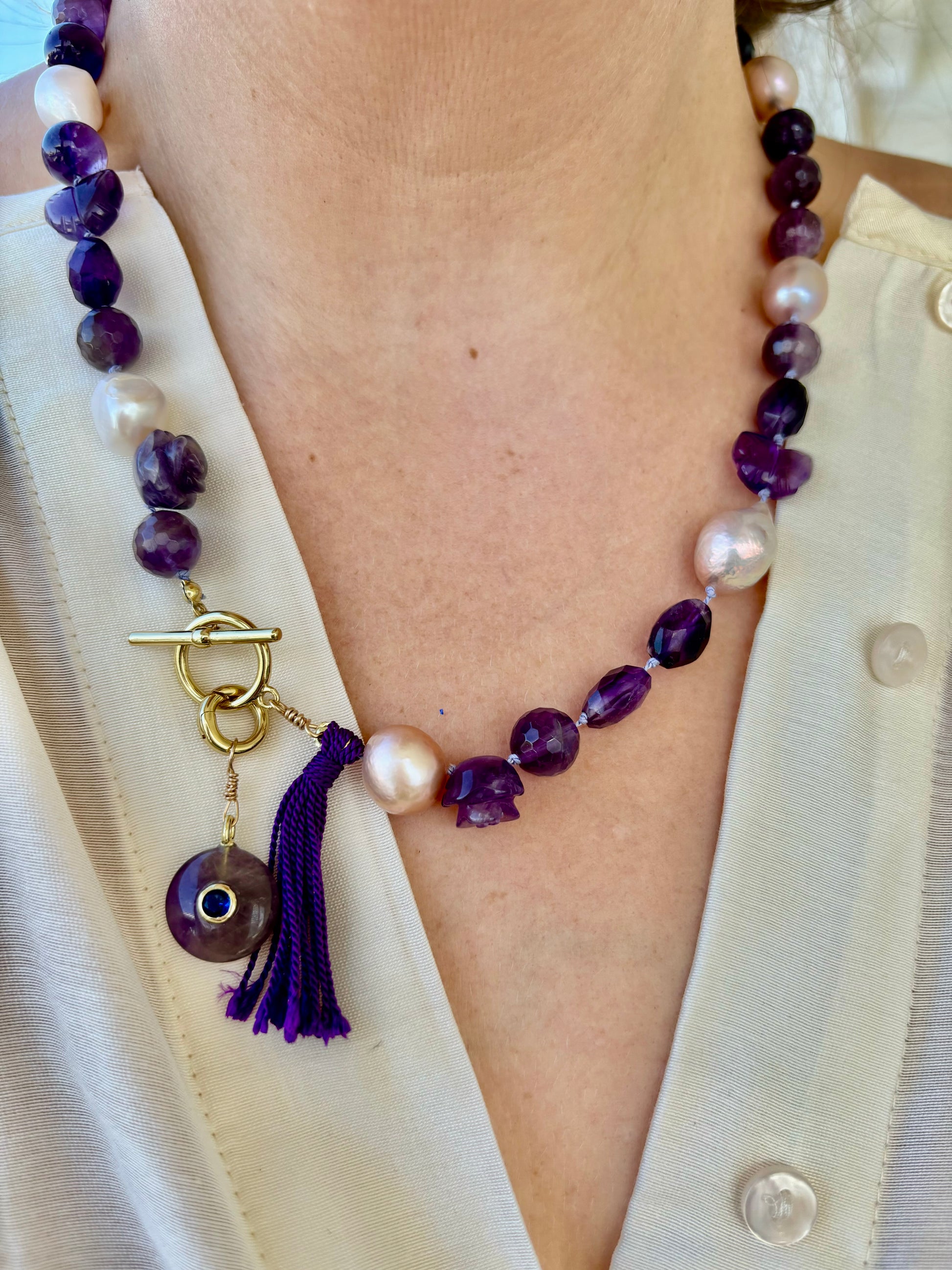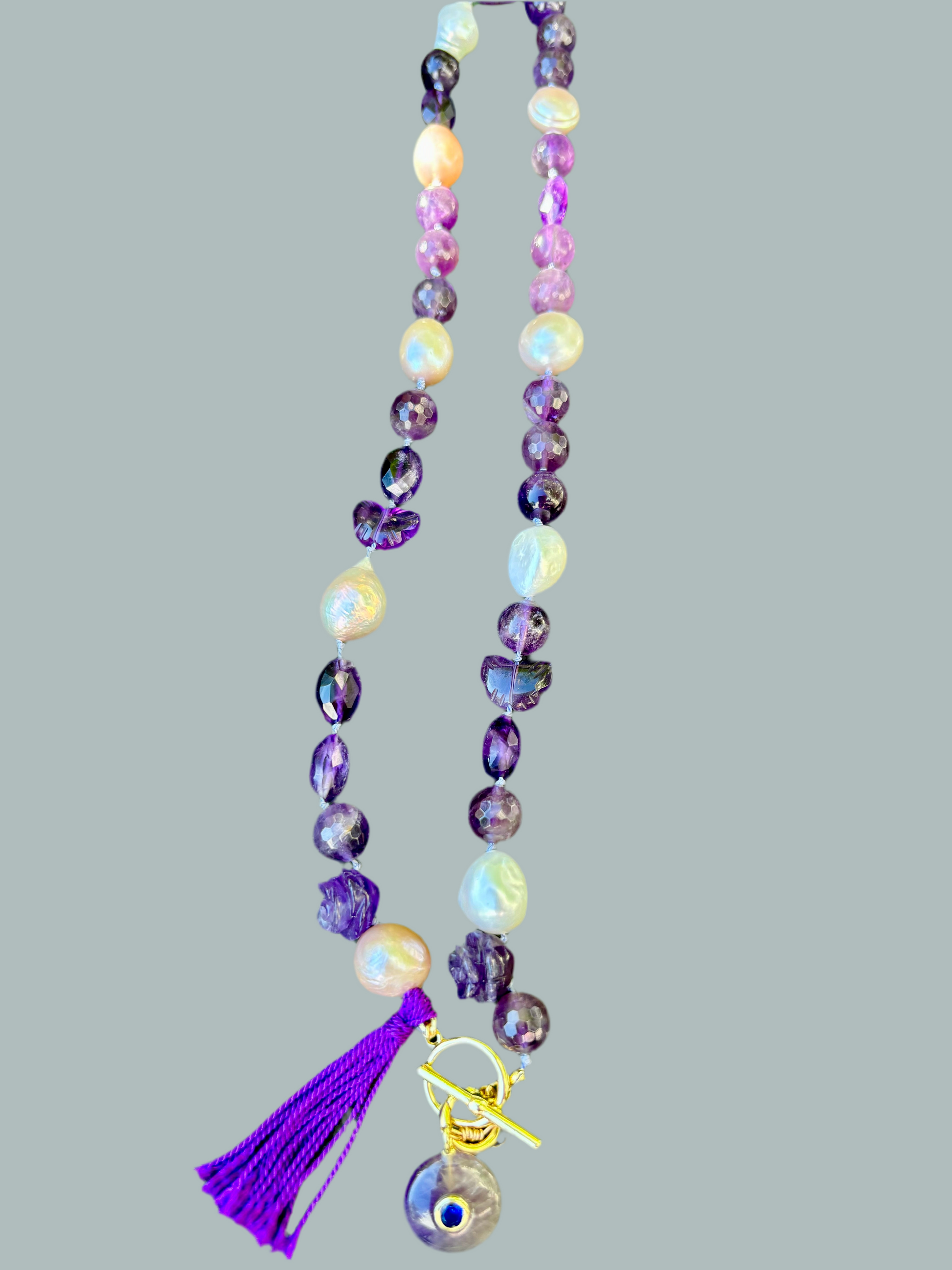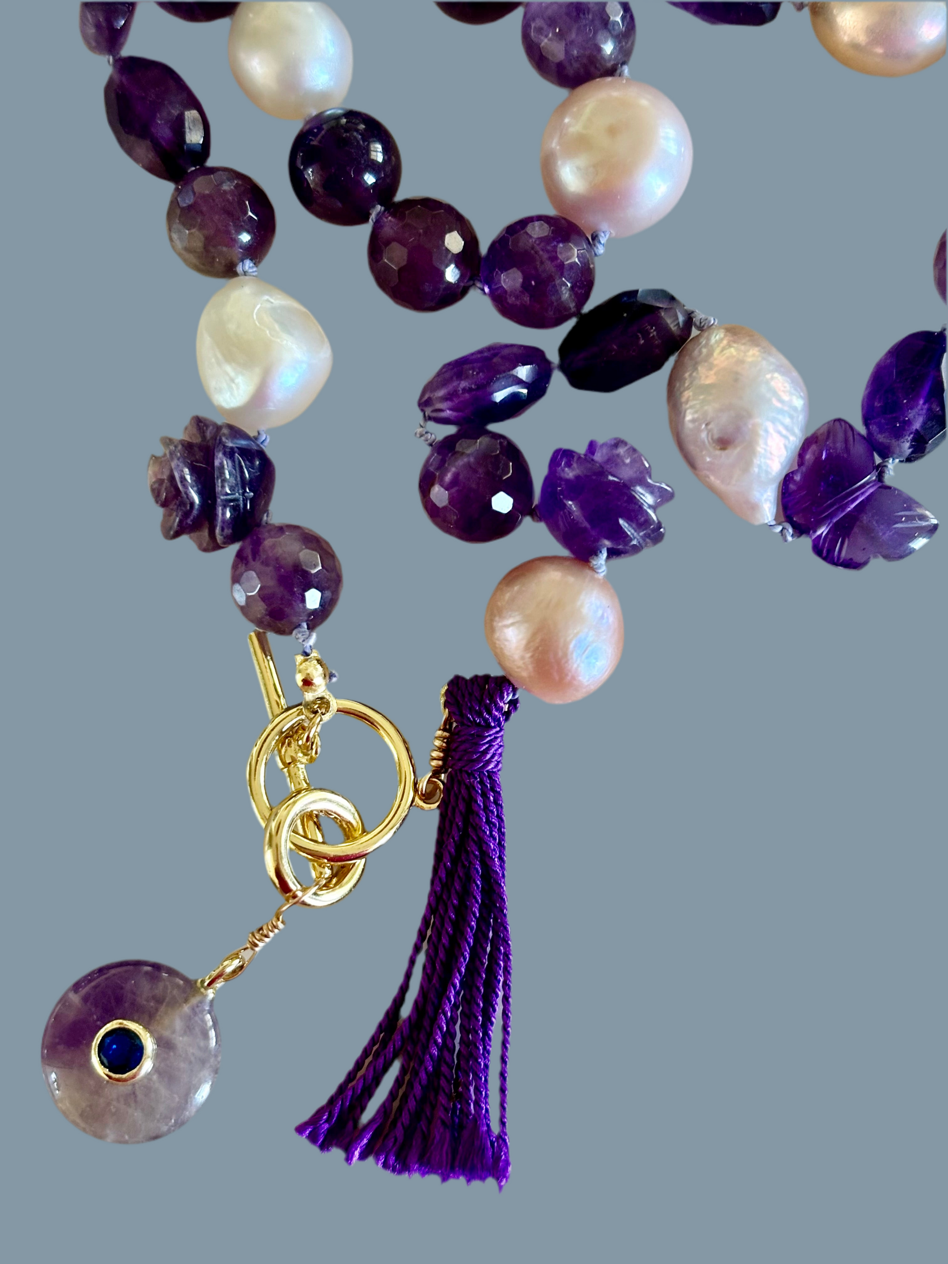 One and only piece. Knotted Amethyst, freshwater pearls. Quartz removable charm. Gold filled toggle.