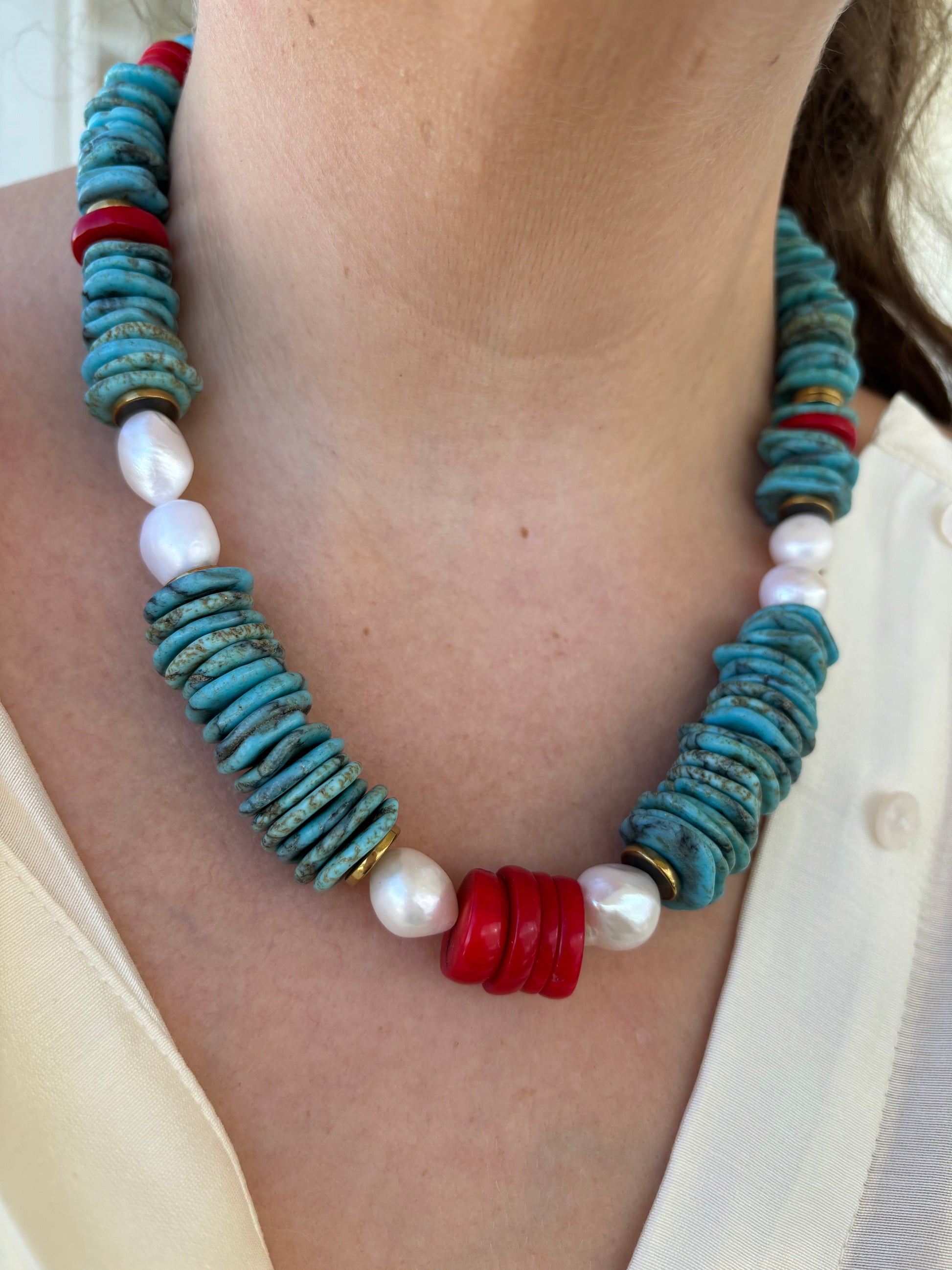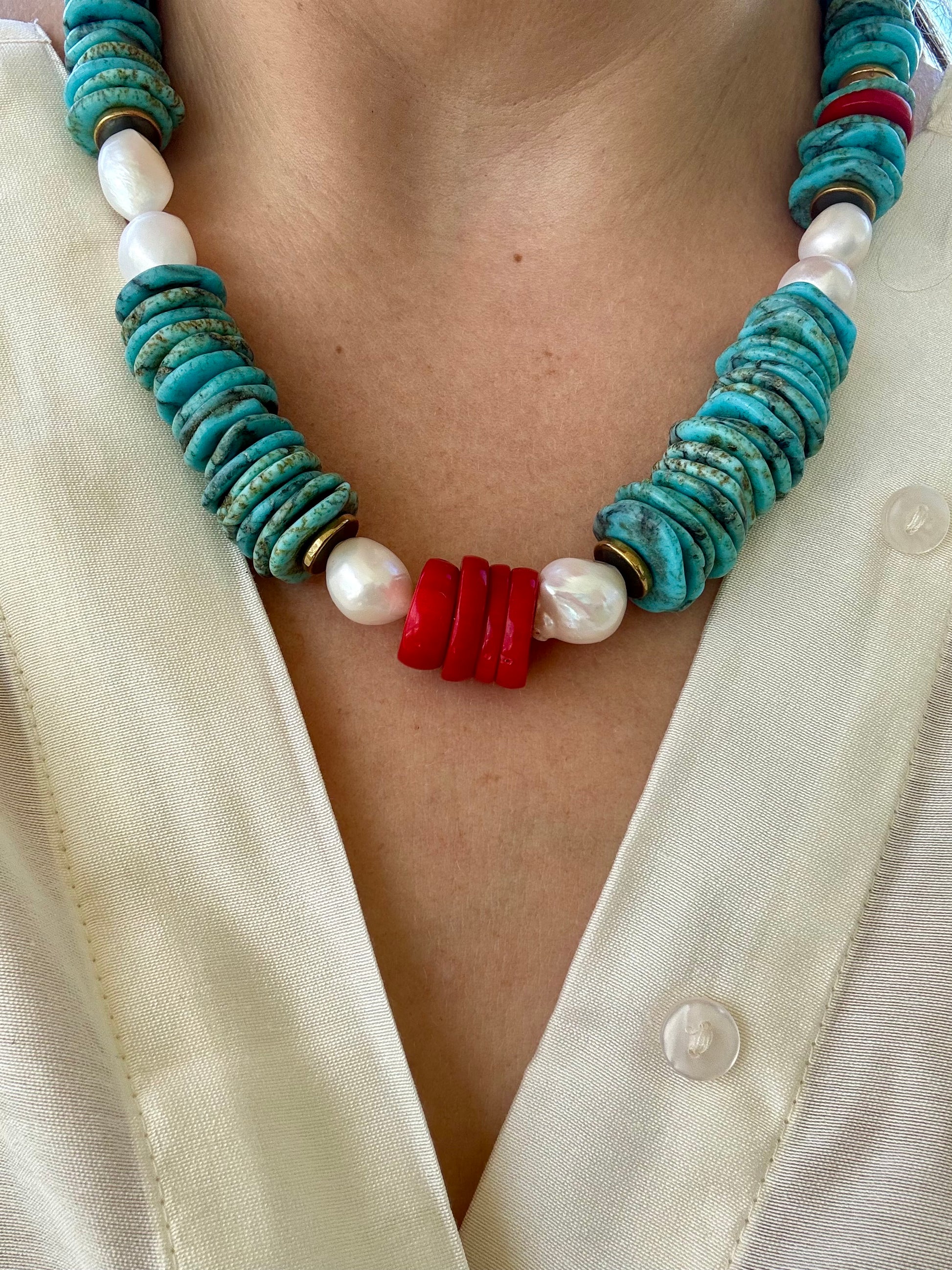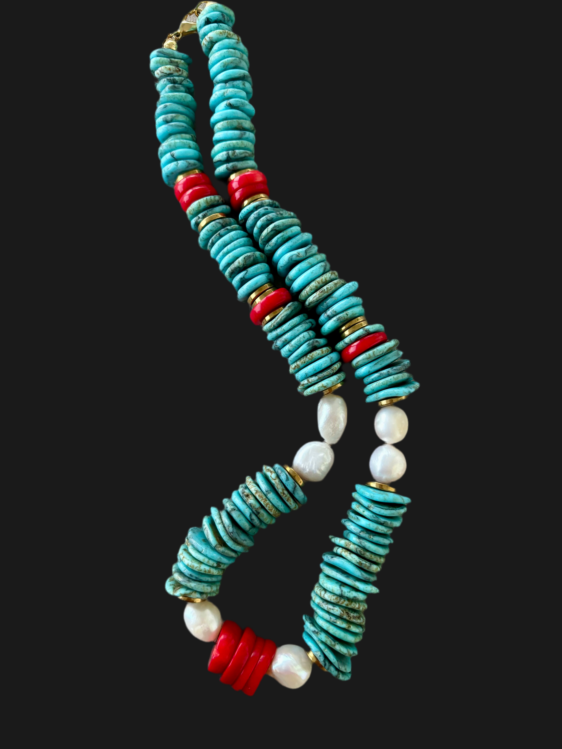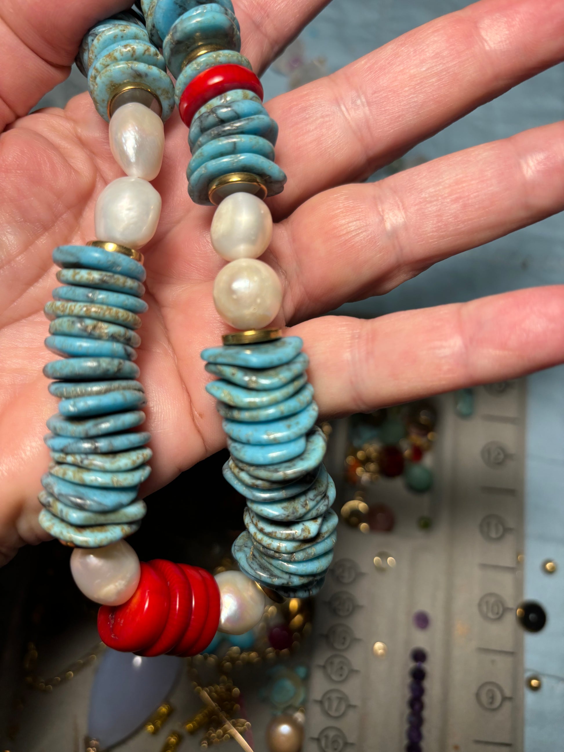 One of a kind. Turquoise, coral and freshwater pearls. Approx 19”.